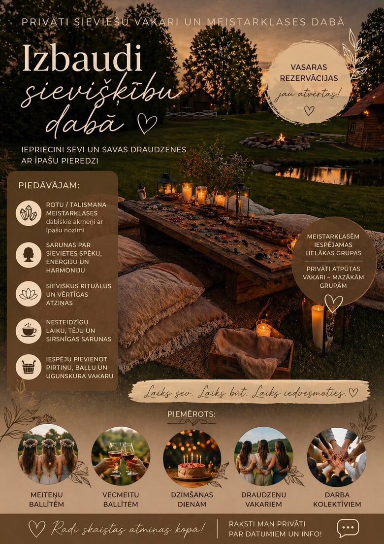Pasākuma laikā mēs veidosim dabīgo akmeņu rotu/talismanu ar īpašu nozīmi, runāsim par sievietes spēku, enerģiju, iekšējo harmoniju un tiem mazajiem noslēpumiem, kas palīdz sievietei vairāk būt savā sievietes spēkā.